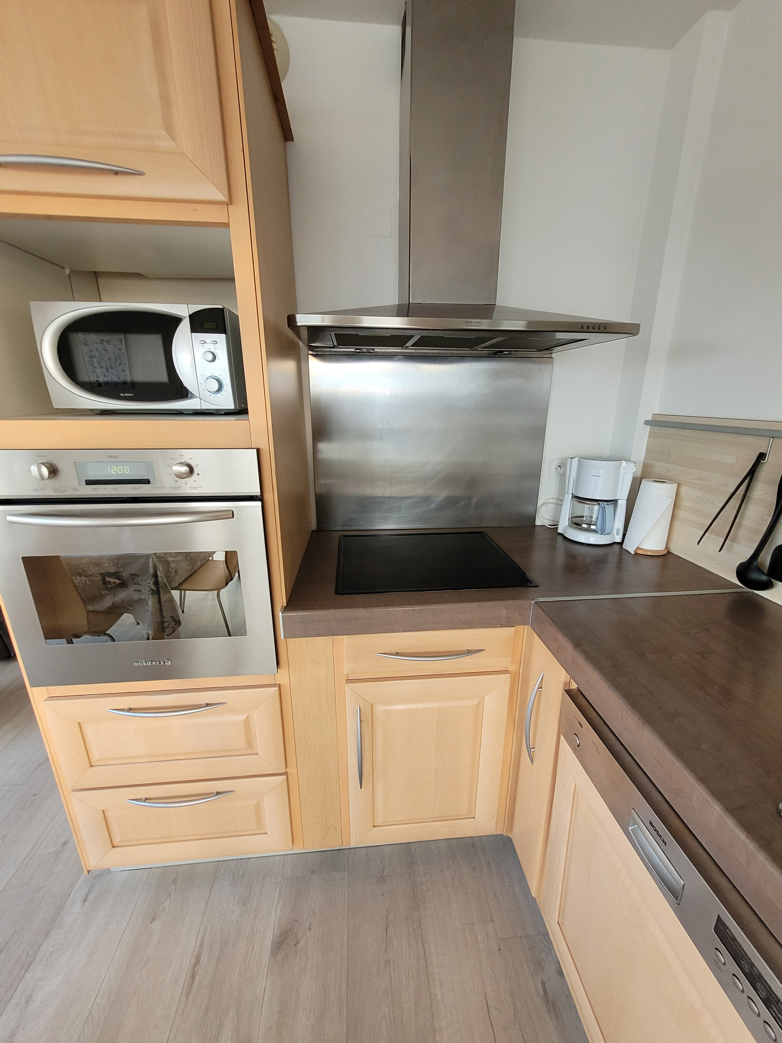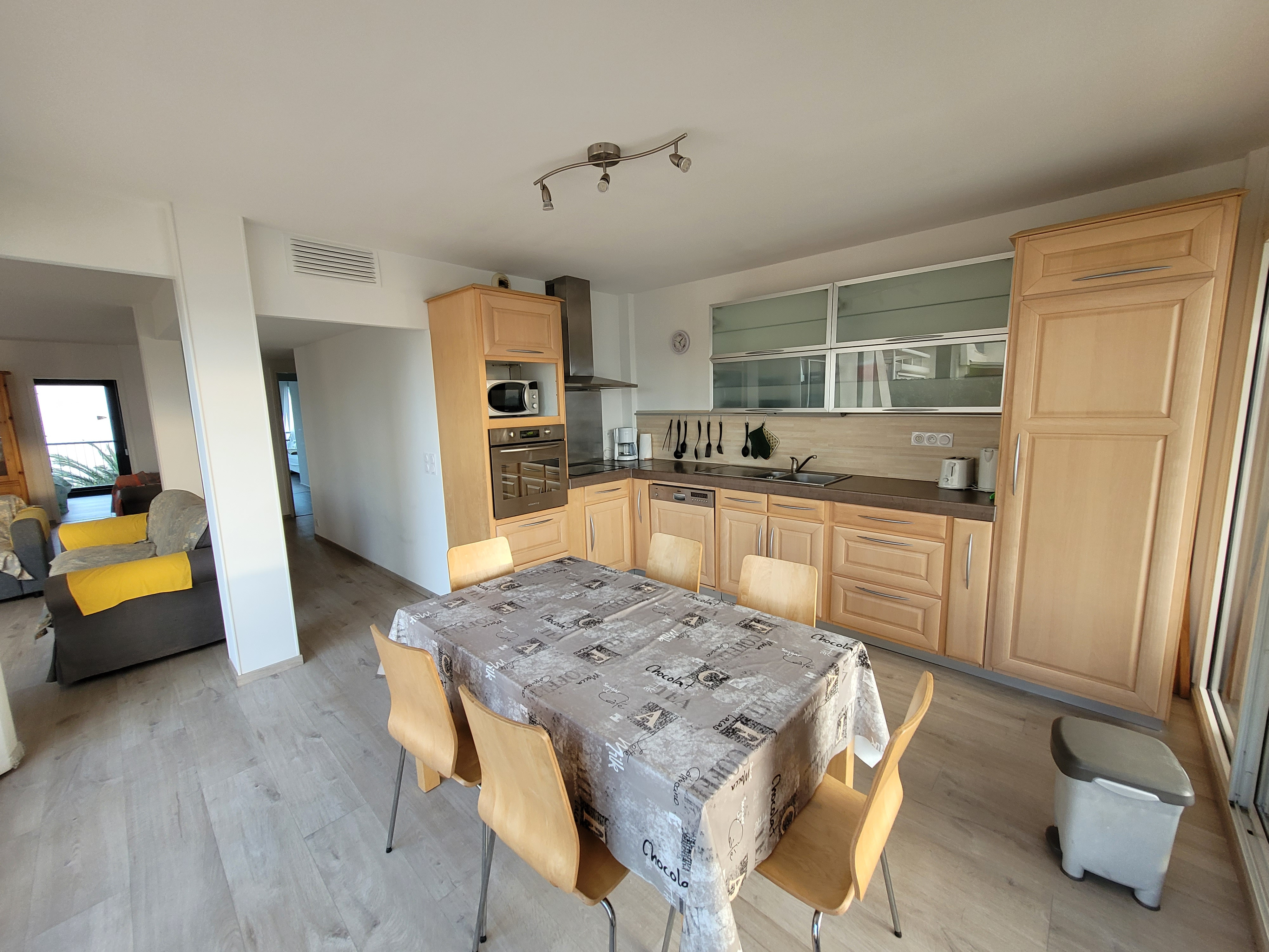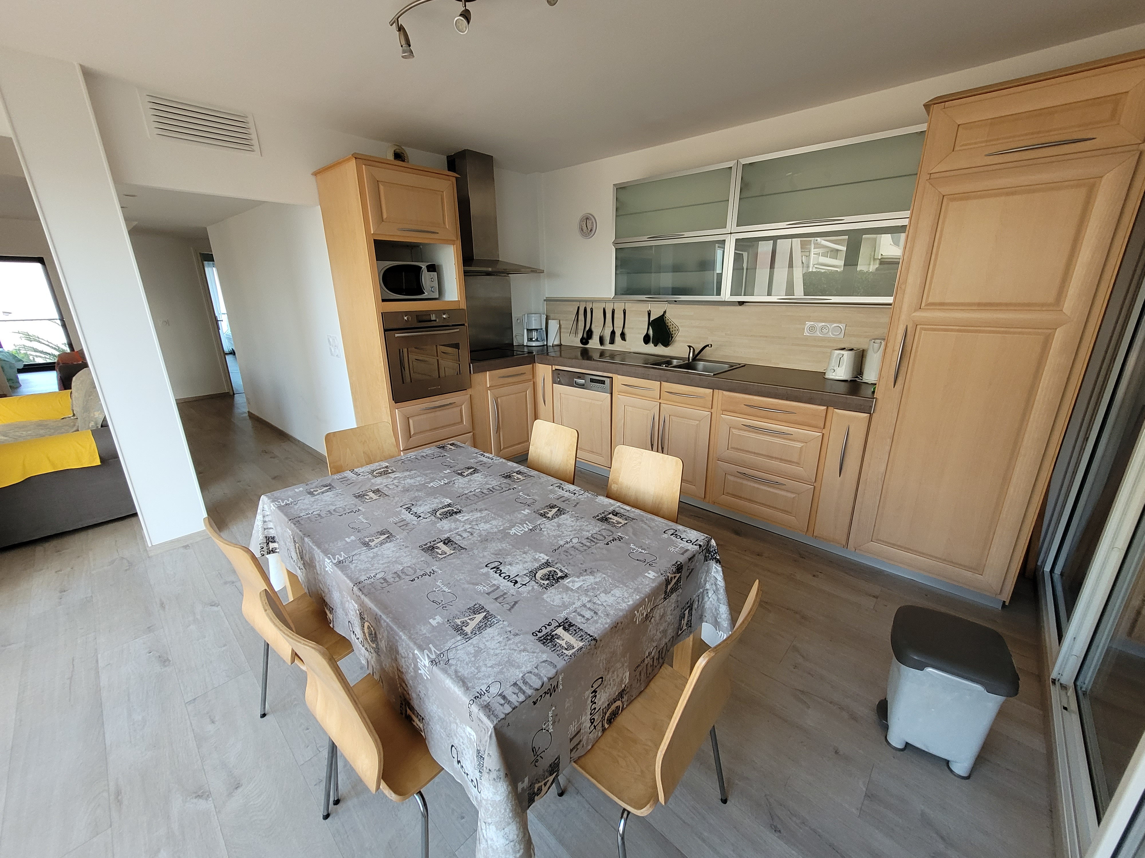 Equipements : climatisation, télévision, lave lingue, lave vaisselle, four, micro ondes, plaque vitrocéramique, frigo avec partie congélateur, grille-pain, bouilloire, cafetière avec filtre, fer et table à repasser