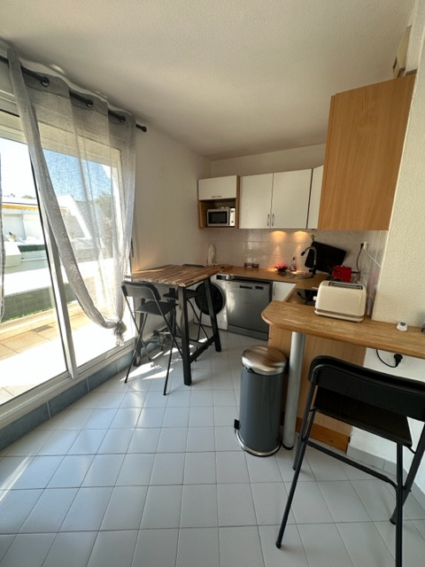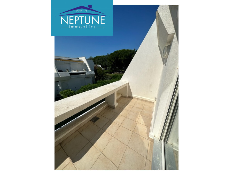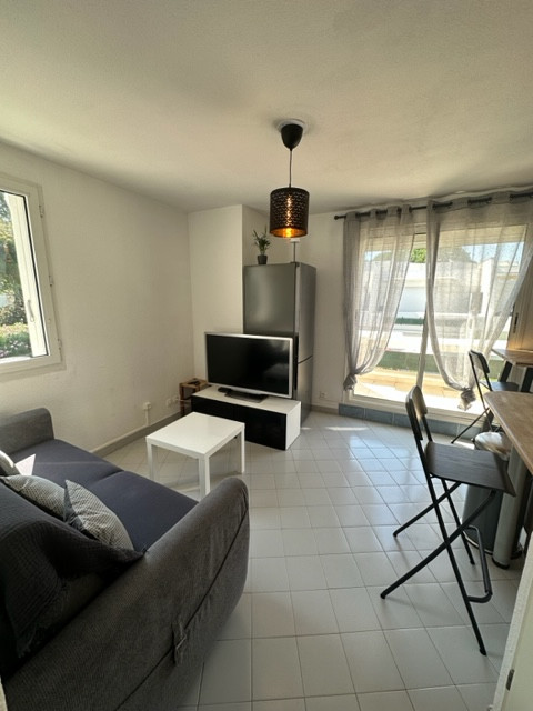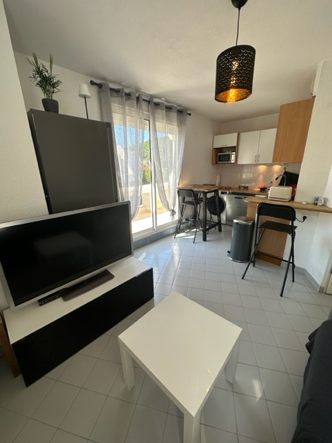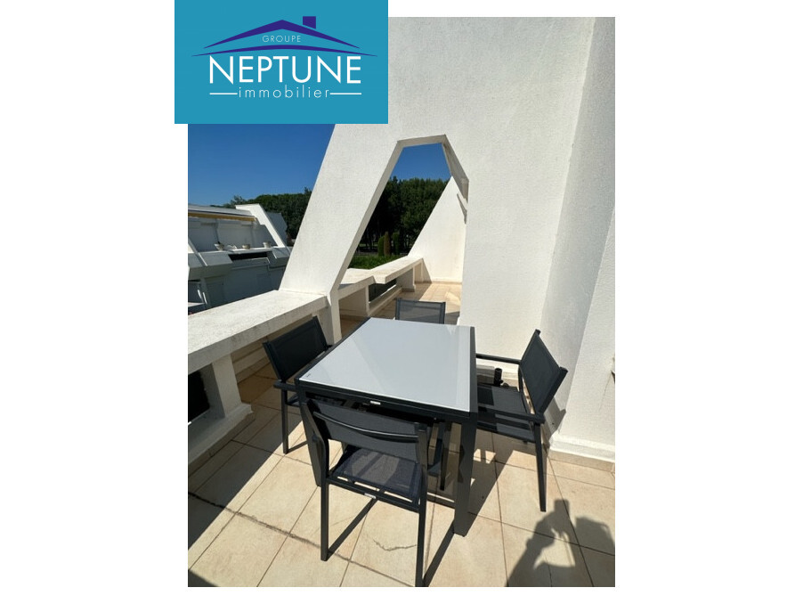 Dans une résidence sécurisée avec place de parking privative, appartement type 2 au 1er étage comprenant entrée, chambre, salle d'eau, wc séparé, cuisine équipée aménagée avec séjour, canapé lit confort, grande terrasse proche de 12m², mobilier extérieur, table chaise.
